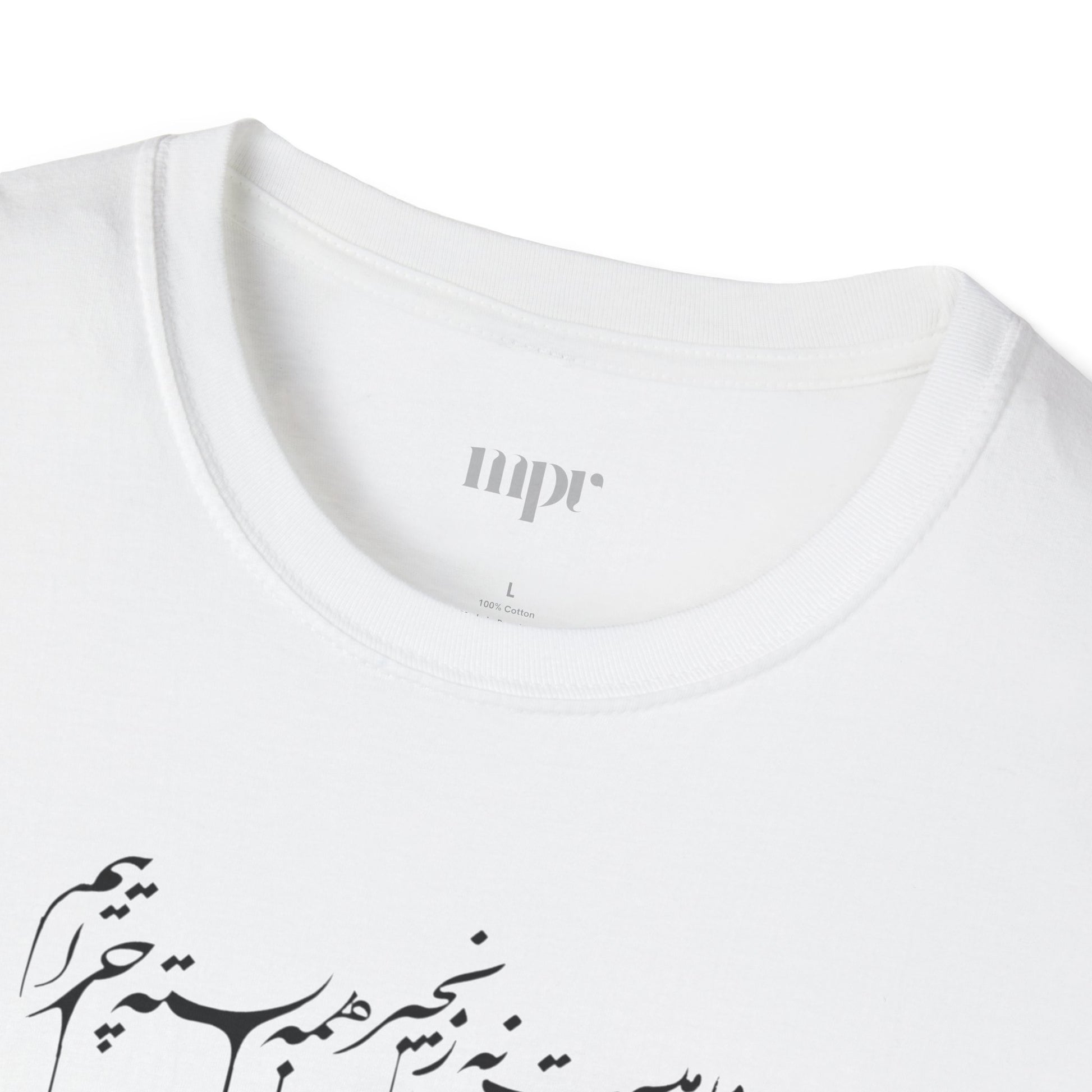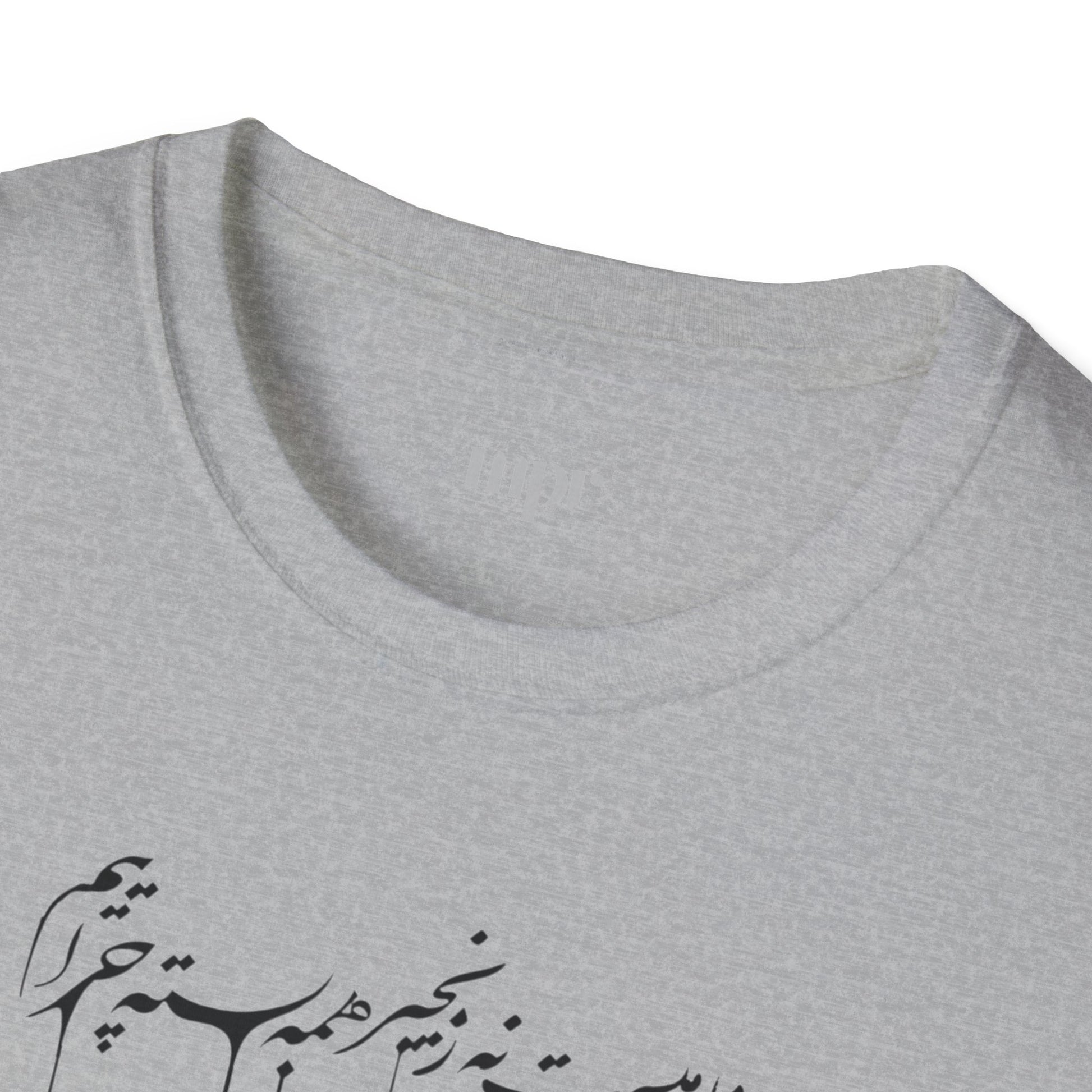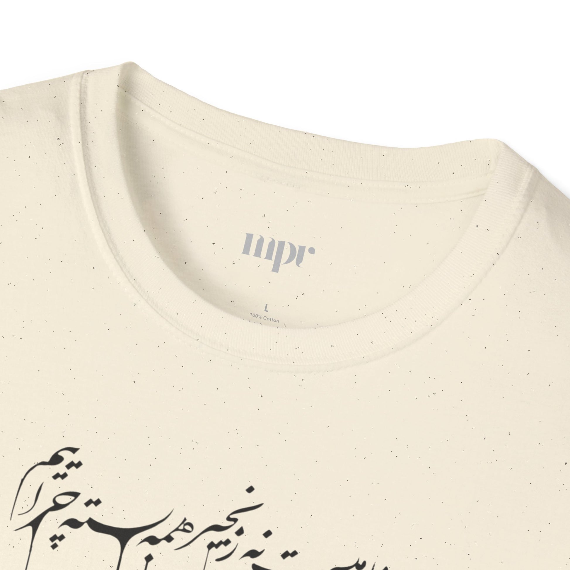 "نه دامیست، نه زنجیر، همه بسته چراييم", “We are neither trap nor chain, why then are we all bound?” This T-shirt features the swirling silhouette of a darvish in motion, paired with a powerful line of Persian mystic poetry, a call to awaken, to free ourselves from what holds us back. Spiritual, soulful, and timeless.