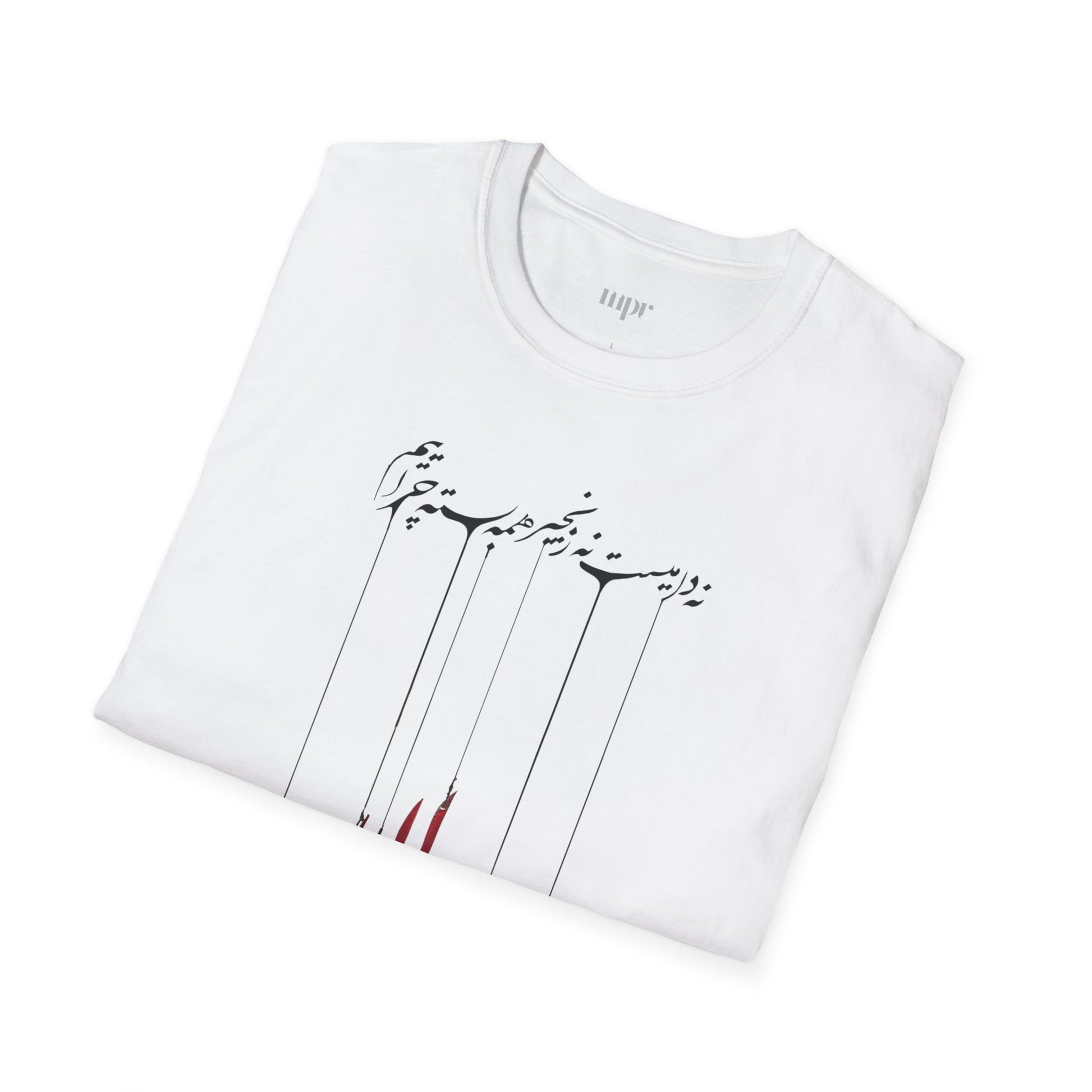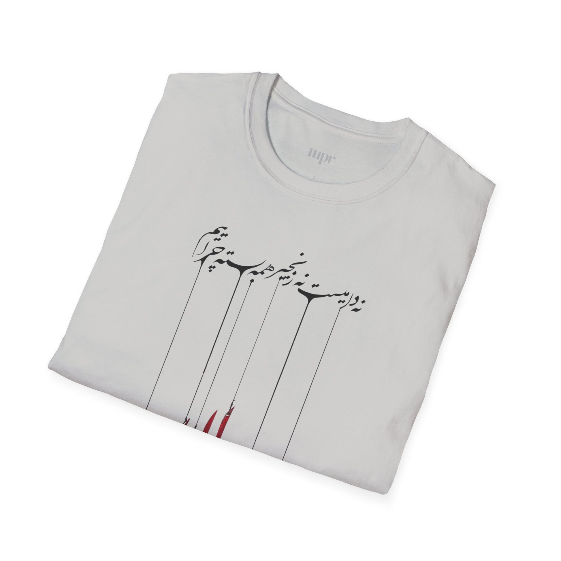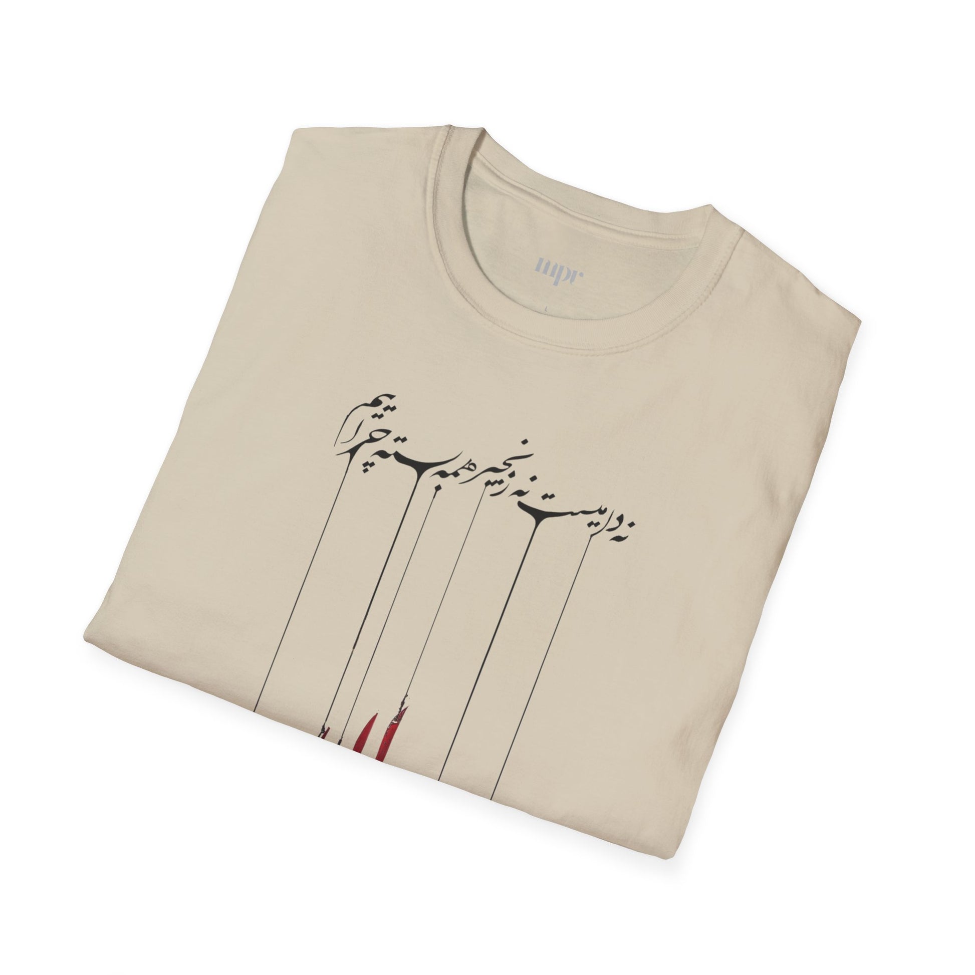 "نه دامیست، نه زنجیر، همه بسته چراييم", “We are neither trap nor chain, why then are we all bound?” This T-shirt features the swirling silhouette of a darvish in motion, paired with a powerful line of Persian mystic poetry, a call to awaken, to free ourselves from what holds us back. Spiritual, soulful, and timeless.