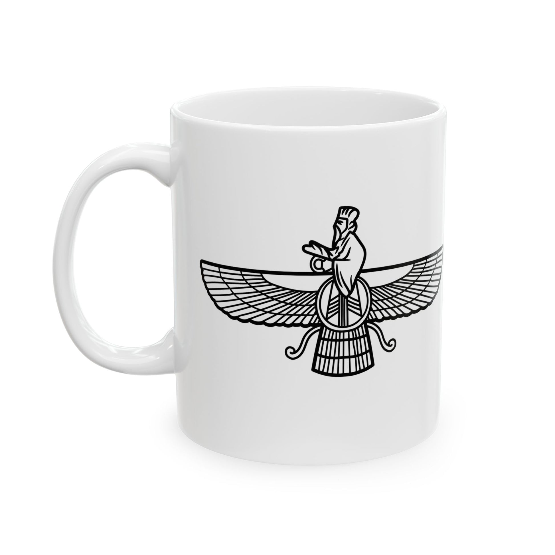 Start your day with strength and soul. This mug features the iconic Farvahar symbol — a timeless emblem of light, wisdom, and Persian heritage in every sip.