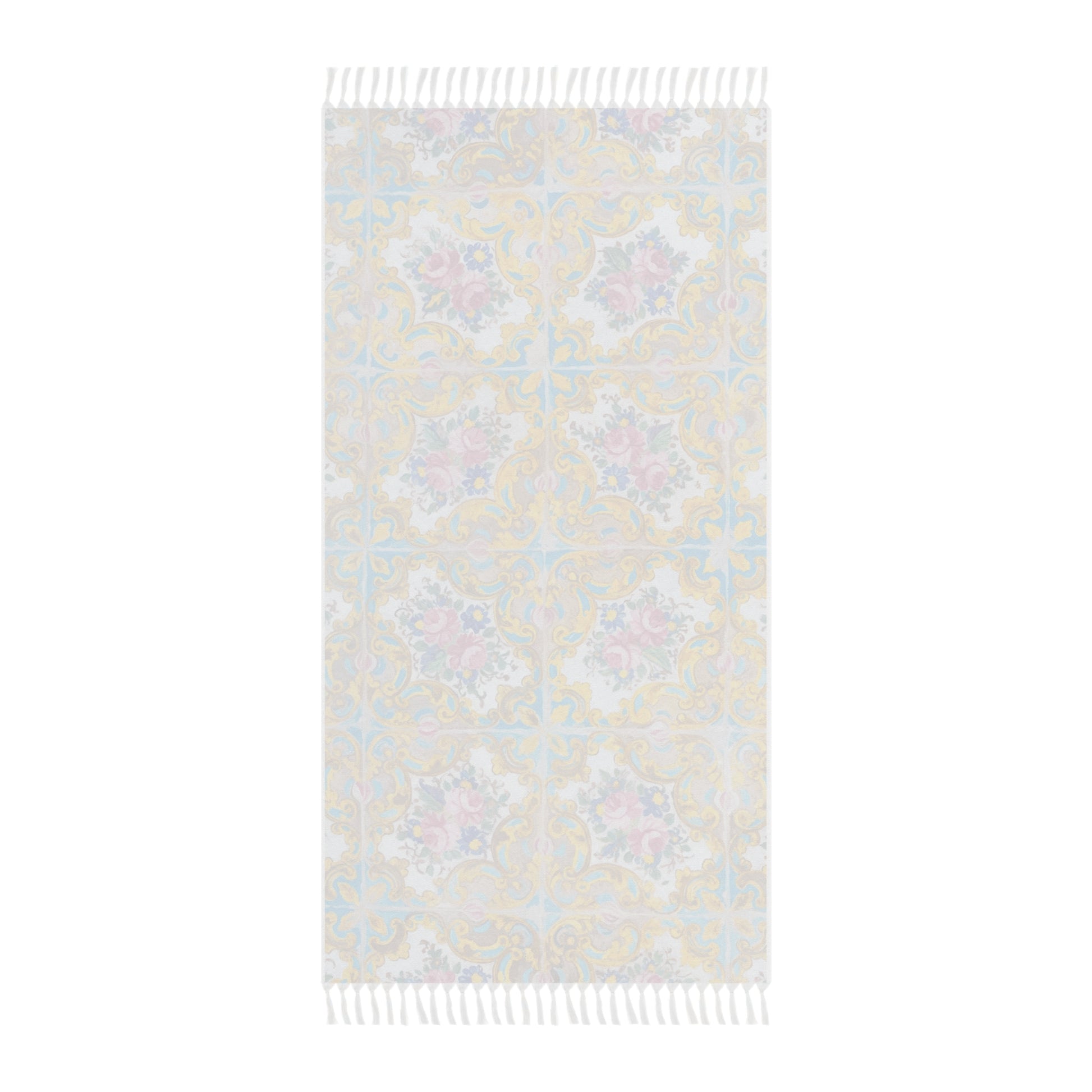 From the Garden of Tiles collection, this gold and sapphire boho-style beach cloth brings the magic of ancient mosaics to sunlit shores.
