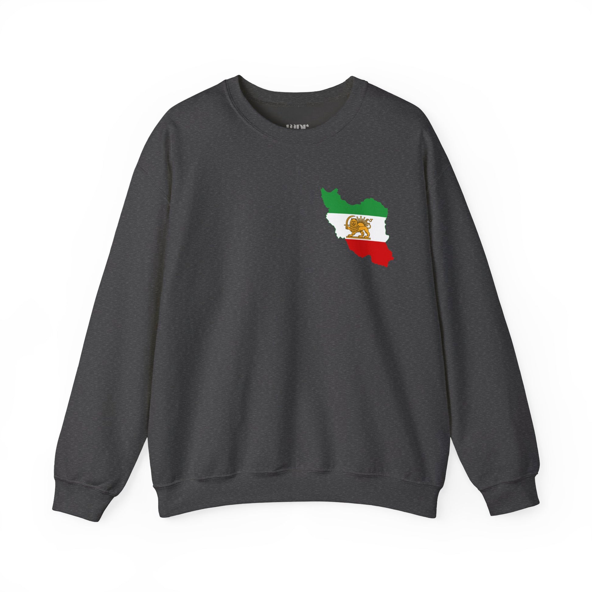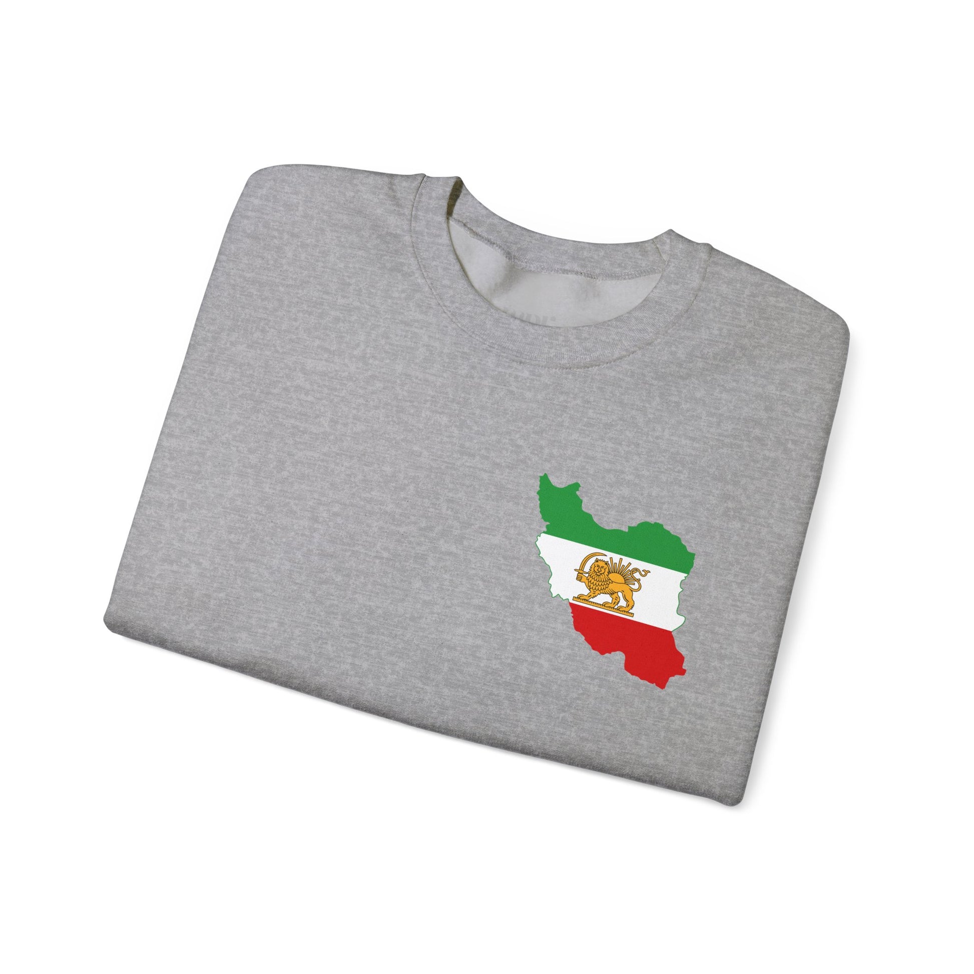 A bold sweatshirt featuring the Lion and Sun flag shaped into the map of Iran. This design unites national symbolism and identity in a powerful visual statement, representing heritage, pride, and solidarity with the people of Iran—crafted for comfort and everyday wear.