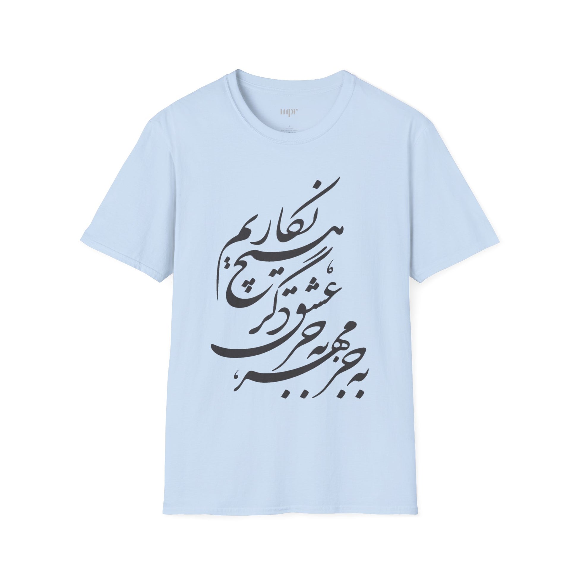 A message stitched in poetry: “به جز مهر، به جز عشق دگر هیچ نکاریم” — (we plant nothing but love). Wear it, mean it.